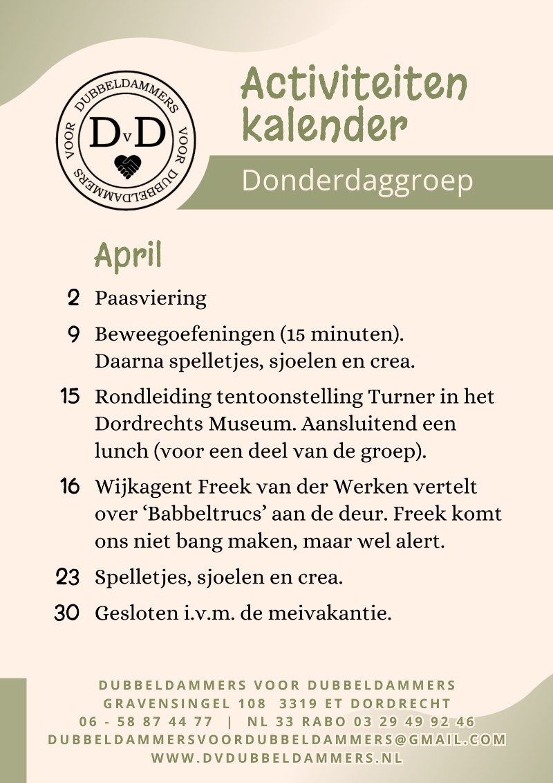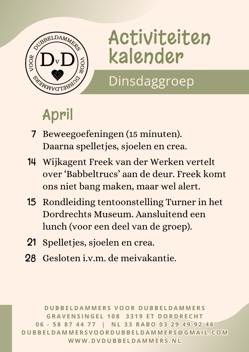 We organiseren activiteiten, zoals spelletjes, creatieve workshops, samen bewegen, een quiz of een leuk uitje. Soms nodigen we een spreker uit of trekken we er samen op uit. Iedereen doet mee op de manier die bij hem of haar past. Alleen aanwezig zijn voor een praatje is ook helemaal goed.