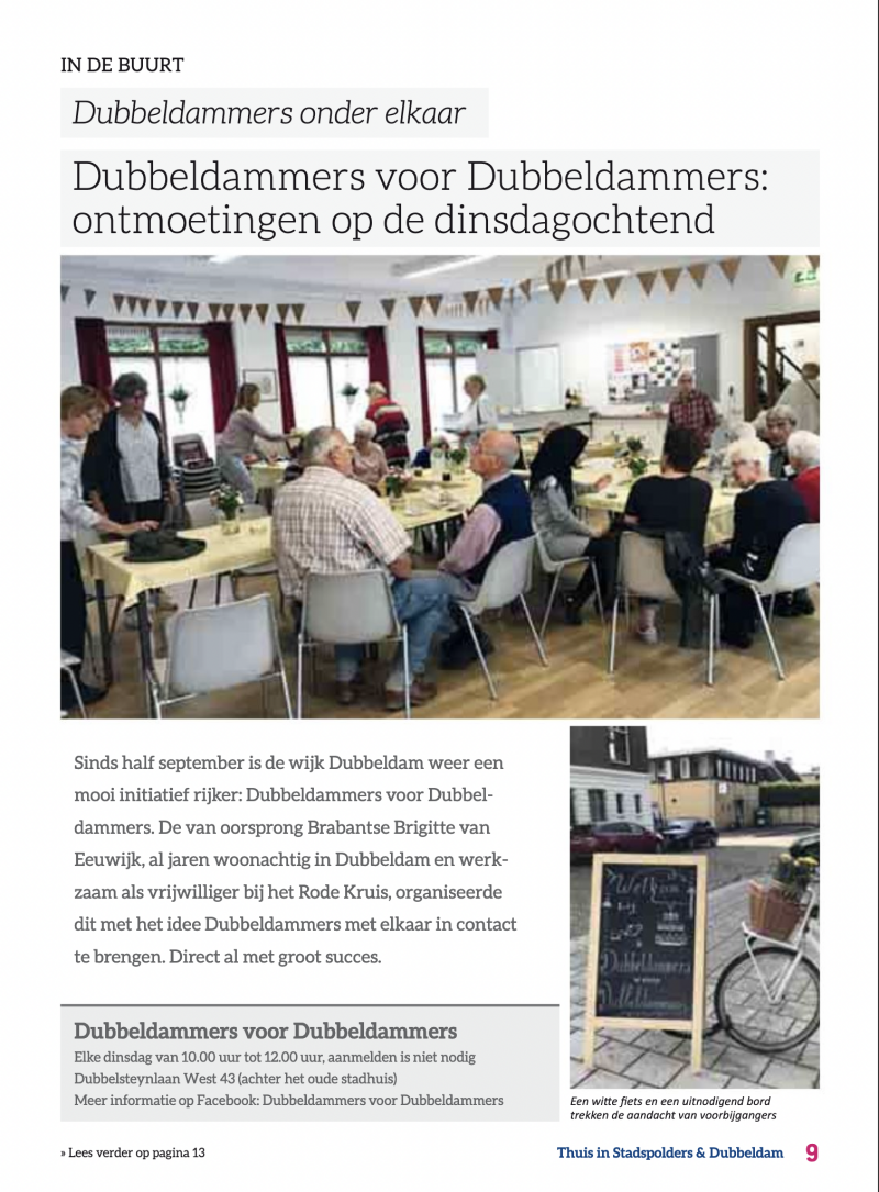 Eind vorig jaar zag Brigitte in de krant een stukje staan over Sterrenburgers voor Sterrenburgers, een ontmoetingsplek in de wijk waar bewoners elkaar op vaste tijden kunnen treffen. Ze besloot contact op te nemen met de initiatiefnemers en ging, op aanraden van MEE Drechtsteden, in gesprek met alle sociale (zorg)instellingen in Dubbeldam. Alle tijd en energie heeft geleid tot de oprichting van Dubbeldammers voor Dubbeldammers.