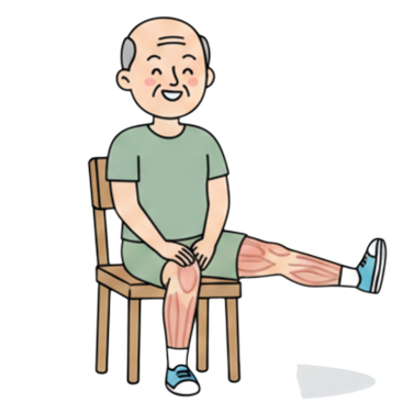 Zit rechtop. Strek één been vooruit en span de bovenbeenspier aan. Houd 10 seconden vast. Wissel daarna van been.